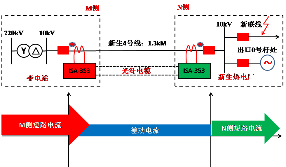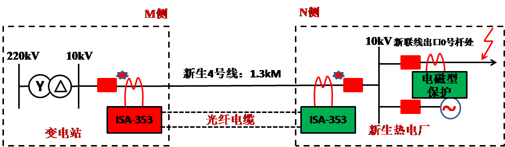 2007年8月5日某220kV变电站10kV新生4号线光纤分相电流差动保护动作,开关跳闸,经巡线人员检查、故障点在新联线出口0号杆处保护人员检查两侧保护装置,模拟区内外故障保护均反应正确,如下图所示,试分析跳闸原因。