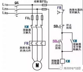 若没有接触器的参与,即没有图中所有标有KM的地方,则SB2按下时回路通电,松开则断电(常开按钮特点,启动按钮都使用常开按钮)。因此我们接入了接触器线圈,并且把常开触点和SB2并联。由此就产生了按下SB2时线圈瞬间通电从而闭合常开触点,以保证松开SB2时回路依然有电的效果。